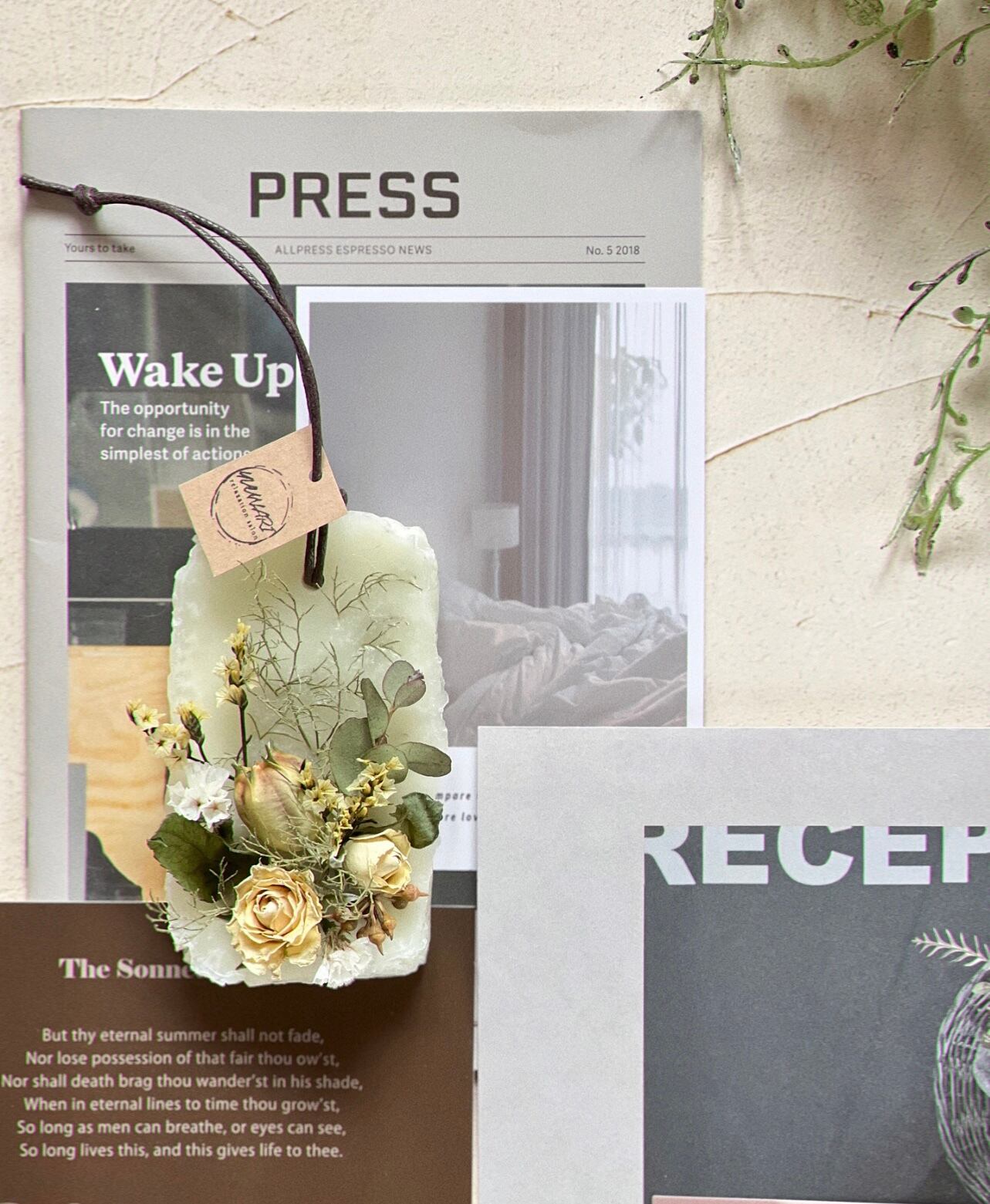 ゴツゴツとしたワックスでアンティーク感を出し、キナリっぽいカラーのローズ、フーセンポピー、ユーカリ、スターチス、カスピアを使いよりナチュラルなアンティーク感たっぷりのワックスサシェが仕上がりました