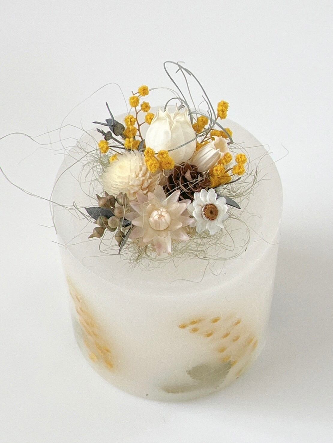 上部にはミモザをはじめ可愛らしいお花をあしらっており、火を灯さない時でもとても素敵なフラワーインテリアとしてお部屋を明るくしてくれます