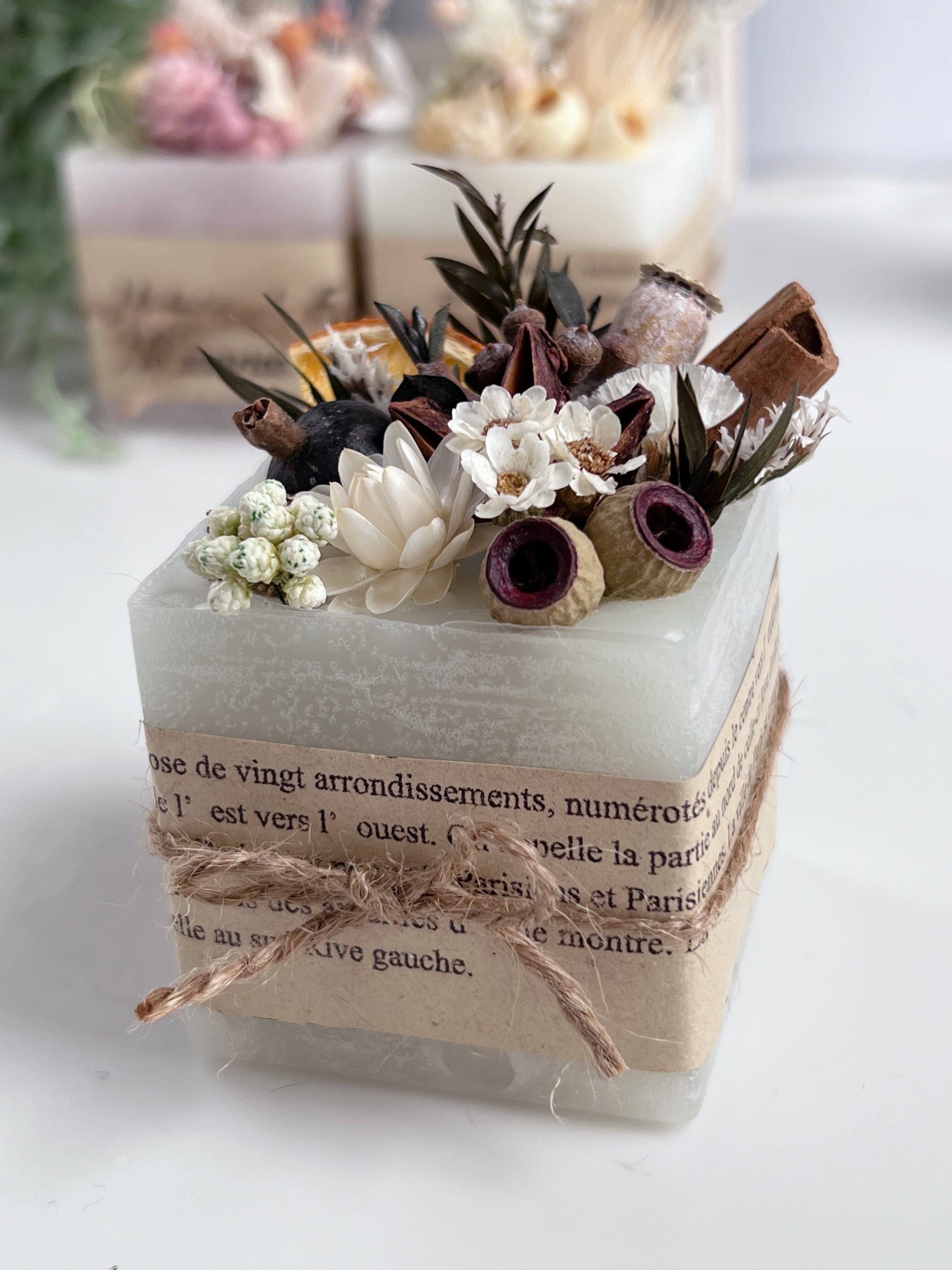 ワックスを使ったキューブ型の土台にドライフラワーや木の実などをバランスよくあしらったキャンドルインテリア雑貨です