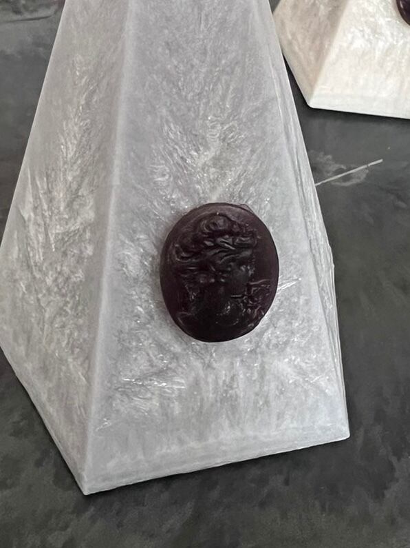 キラキラとした鳥の羽のような模様が特徴で、カメオのモチーフが付いたとても品のあるフォルムとなっております